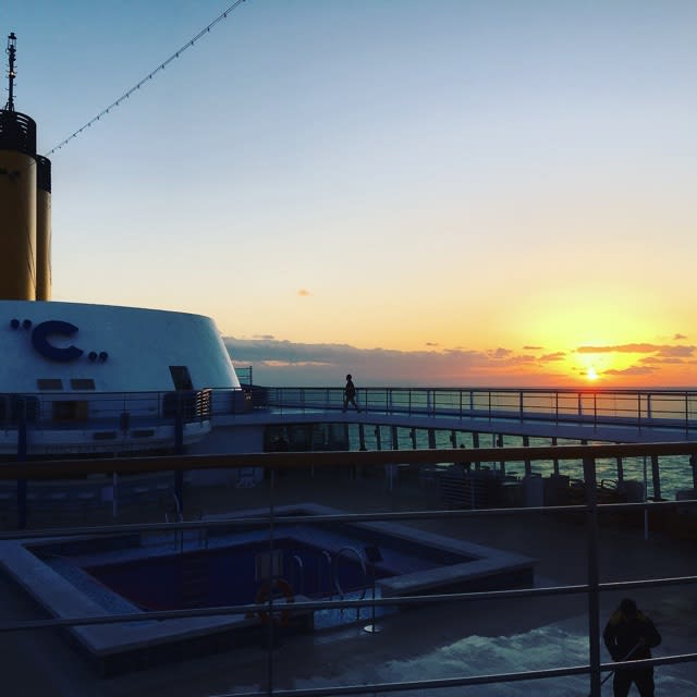 偶然、早く目が覚めてしまったので、船内新聞で、日の出時間を見たら、「まさに今この瞬間」だったので、急いで着替えてデッキ11に出ました!